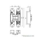 | - Satin Chrome (SC) - Bright Chrome (BC) - Satin Nickel (SN) * Other finishes available on request | - Max. door weight (with 2 hinges): 60kgs - Min. door thickness: 38mm - Max. door width: 1000mm - Max. door height: 2100mm - Max. opening angle: 180° |